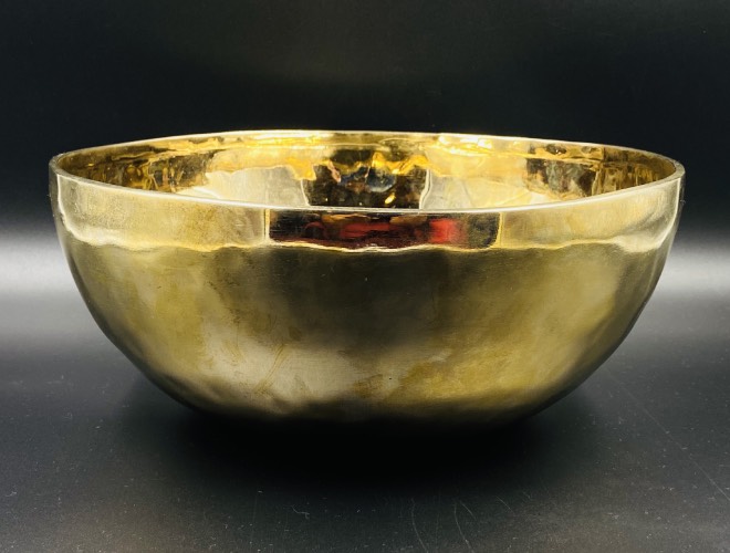 This handmade bowl is made with seven different metals. It is hand-hammered on the exterior and interior and completed with shiny finishing.