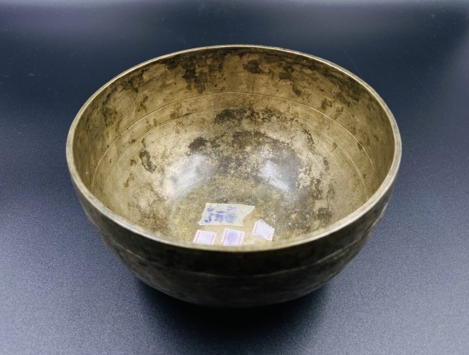 The sound sample is recorded after hitting the lip of the bowl with a red wool mallet.