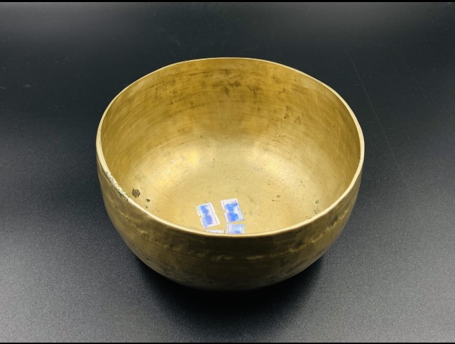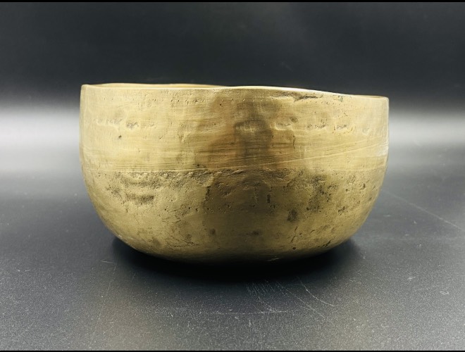 The sound sample is recorded after hitting the lip of the bowl with a red wool mallet.